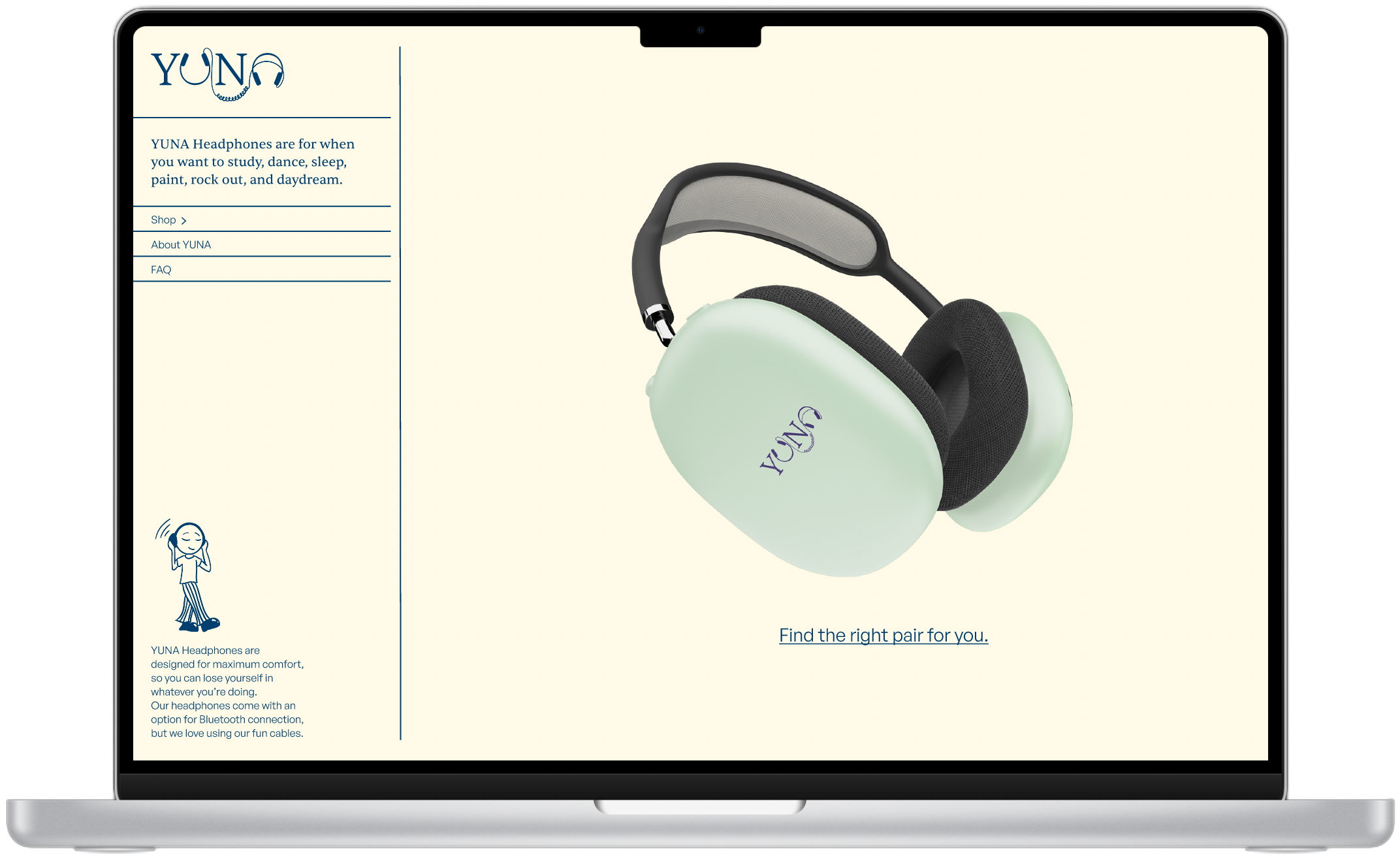 Most noise-cancelling headphone brands focus on technical performance and premium exclusivity. Yuna takes a different approach that celebrates accessibility, ease, and a softer aesthetic. I designed packaging for the headphones and accessories, along with supporting merchandise such as phone cases and water bottles, as well as a website experience. Every touchpoint was created to bring a sense of delight and laid-back creativity into the listening experience.
